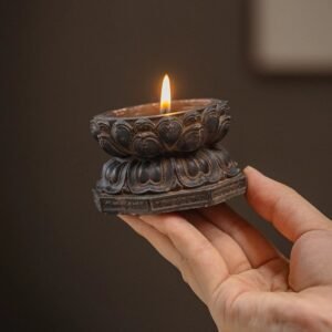 When lit, the soft glow of a candle gently illuminates the lotus petals, creating a calm and contemplative atmosphere — a reminder of balance, renewal, and inner peace.